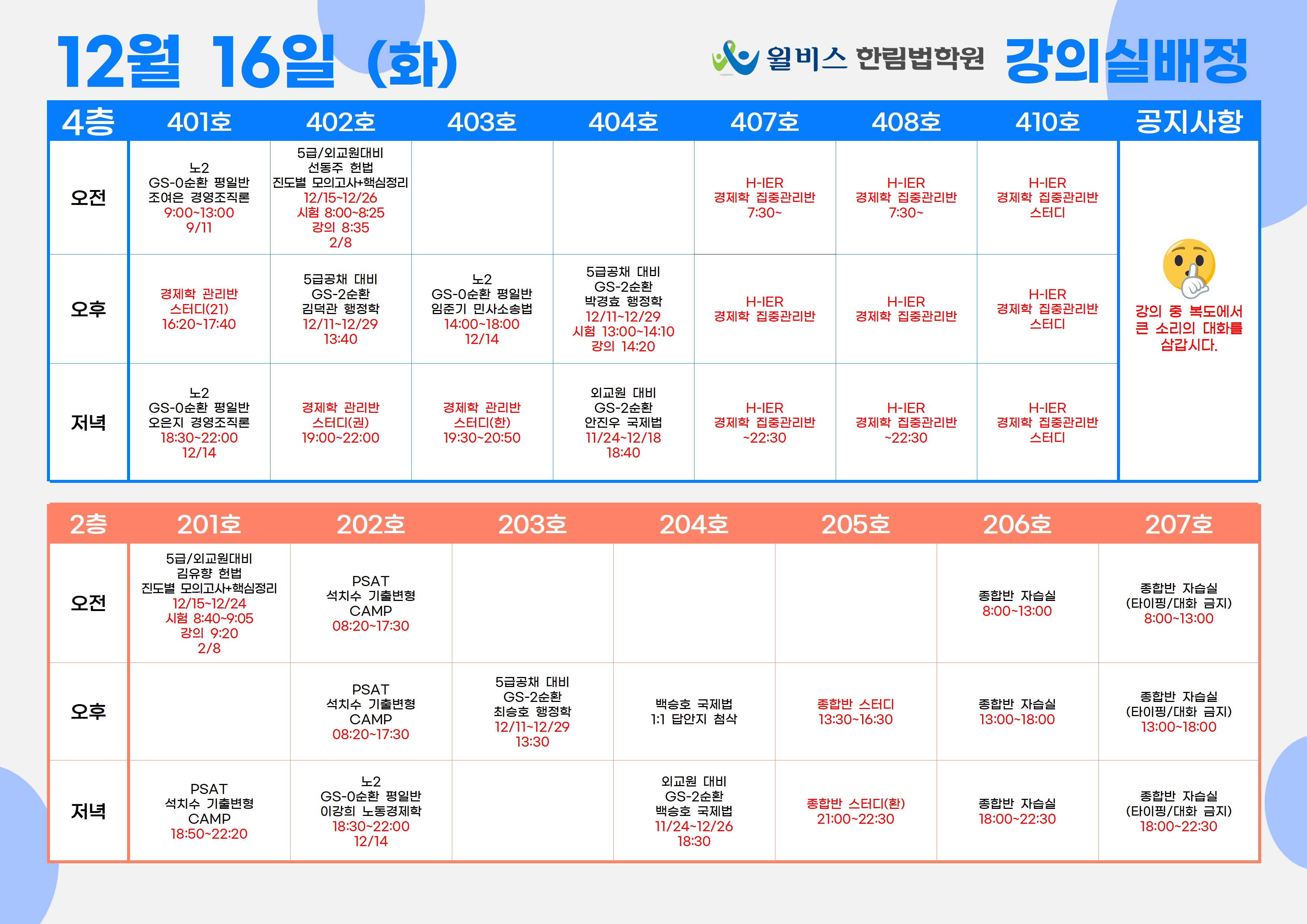 12월 16일(화) 강의실 배정표