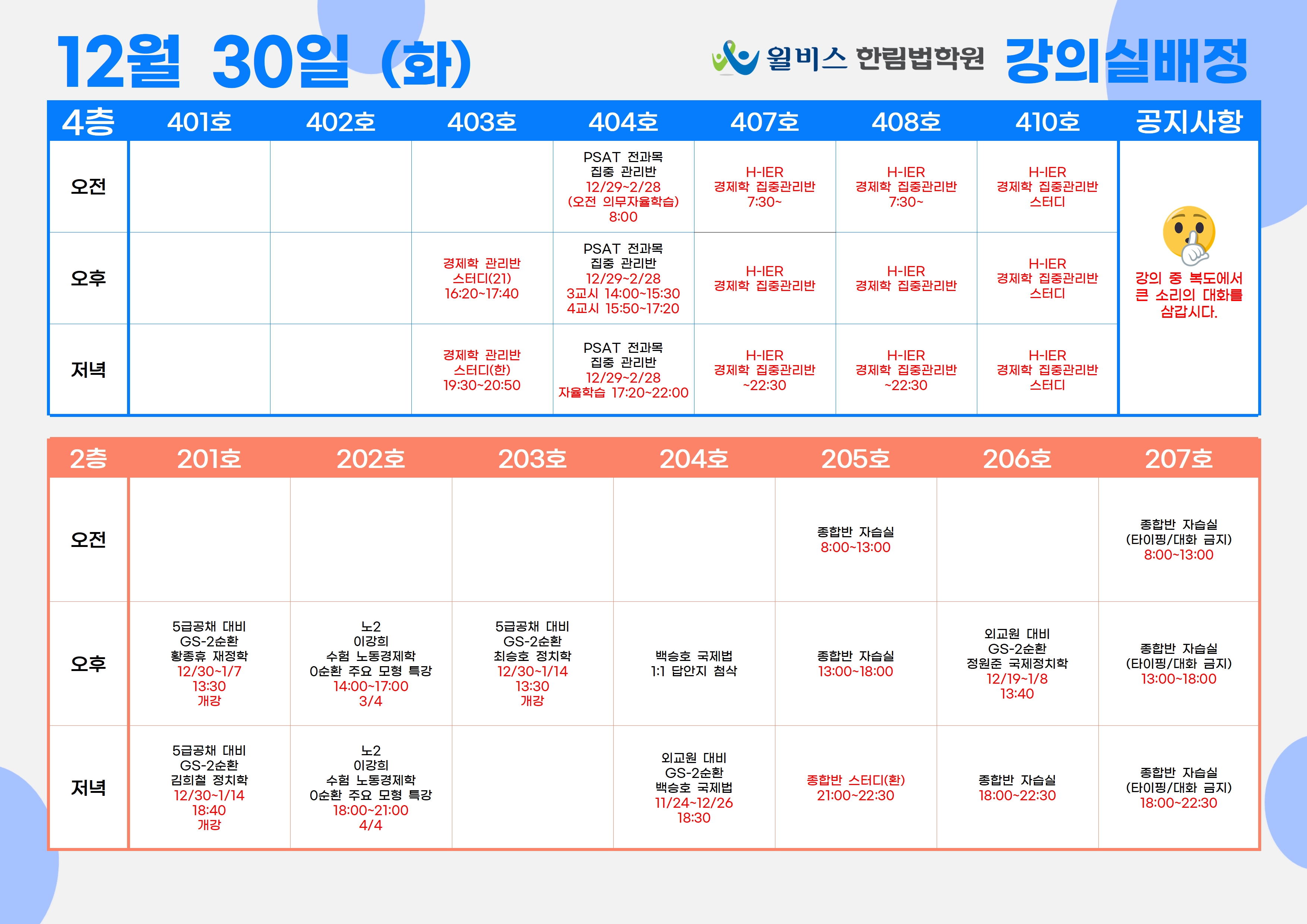 12월 30일(화) 강의실 배정표