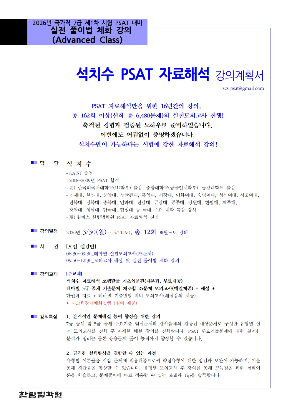 2026년 대비 실전 풀이법 체화 강의(Advanced) 석치수 자료해석 강의계획서