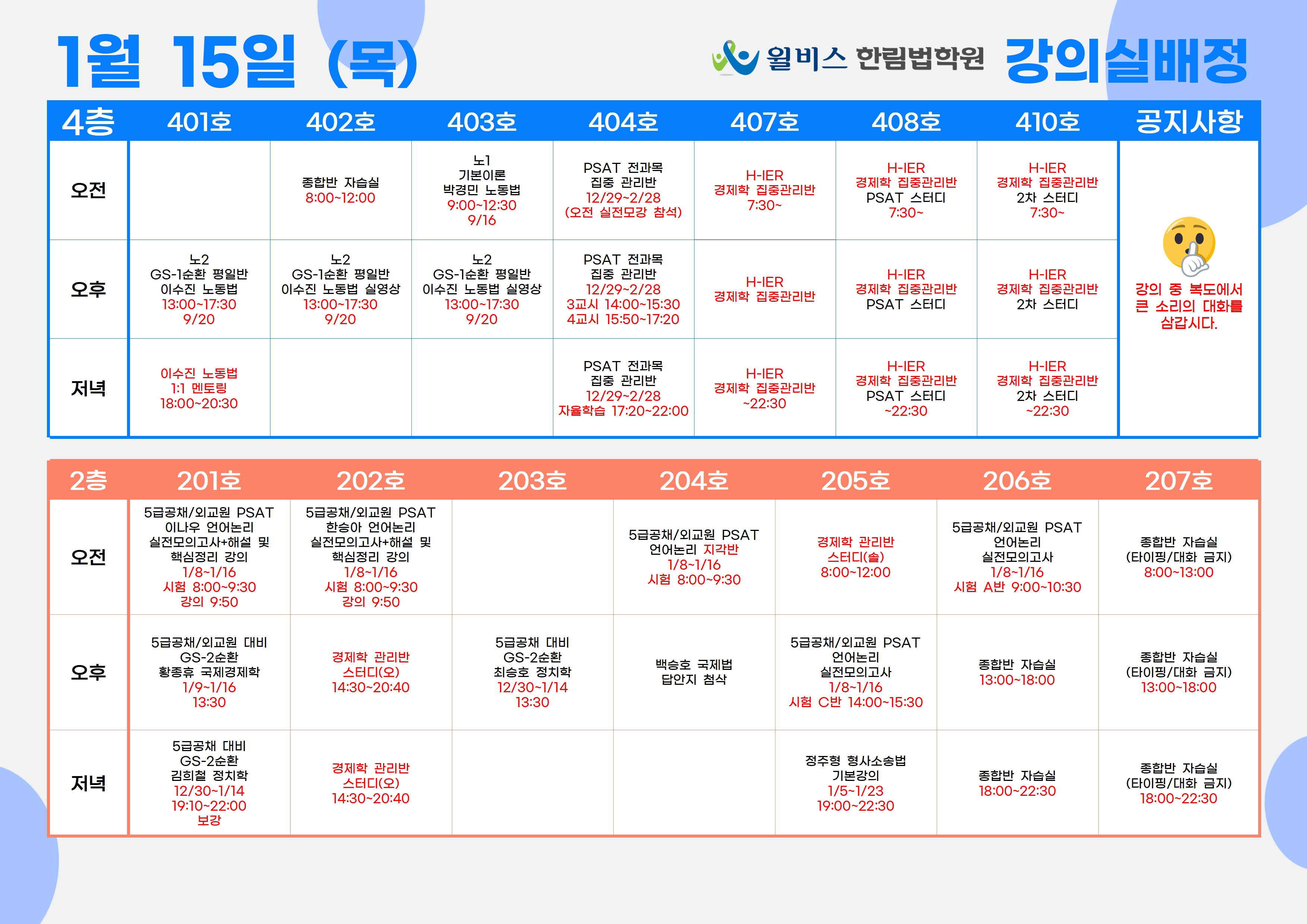 1월 15일(목) 강의실 배정표