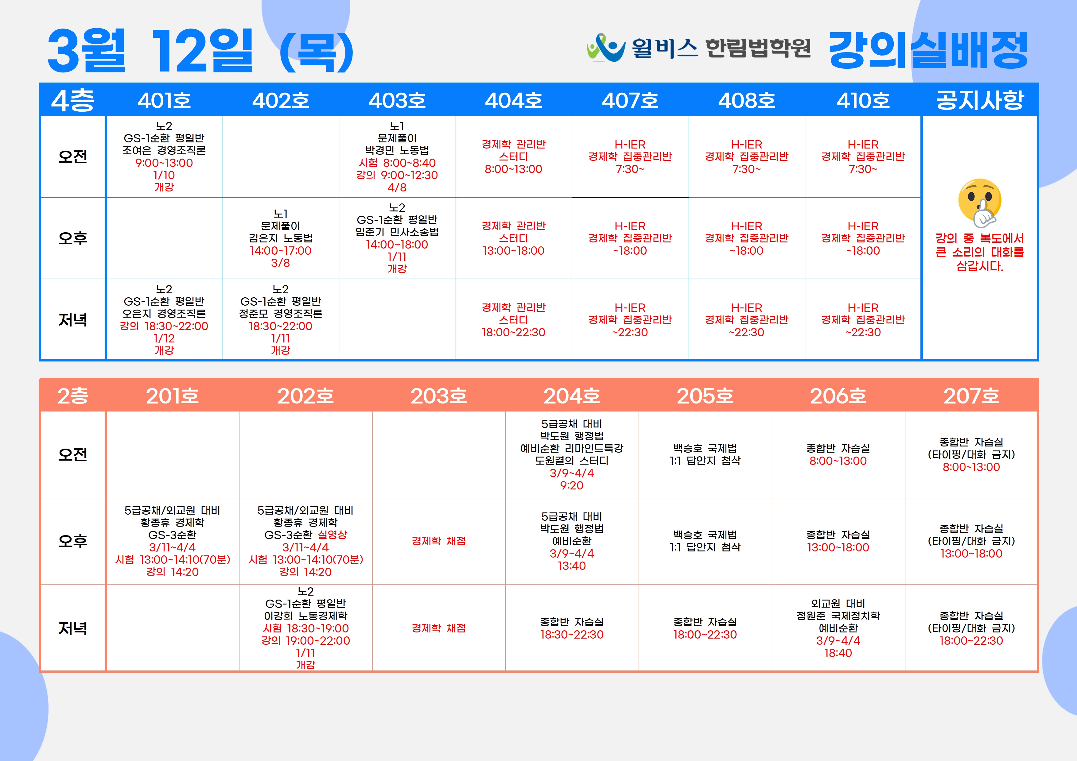 3월 11일(수) 강의실 배정표