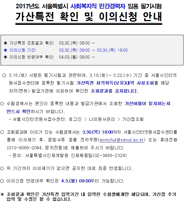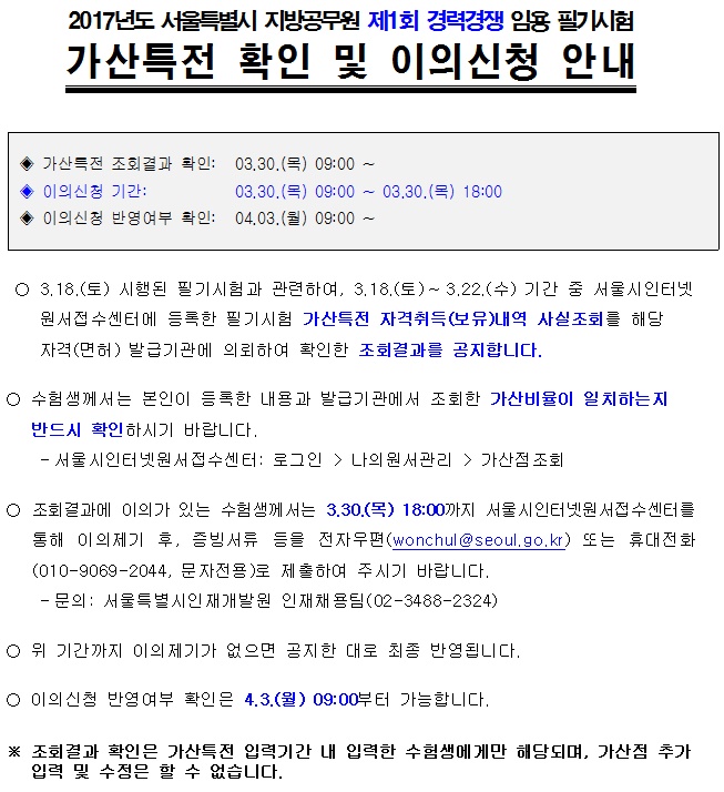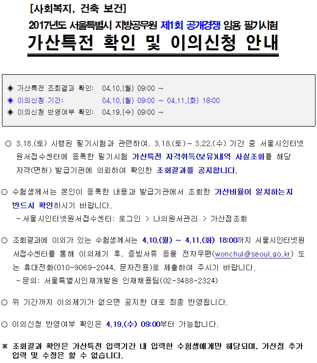 2017 서울시 지방공무원 및 민간경력자 임용 필기시험 가산특전 확인 및 이의신청 안내